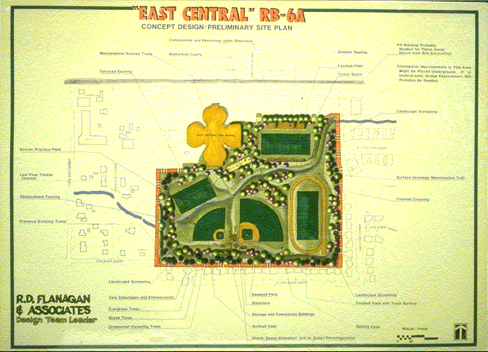 Each of the eight sites and their greenway corridors were unique and required individual analysis and design treatment. The East Central High School site was located on the site of the community high school and the design had to incorporate a football field and stadium as well as a soccer field and two baseball diamonds. The Wright Middle School site incorporated baseball diamonds, soccer fields and jogging trails into the design.